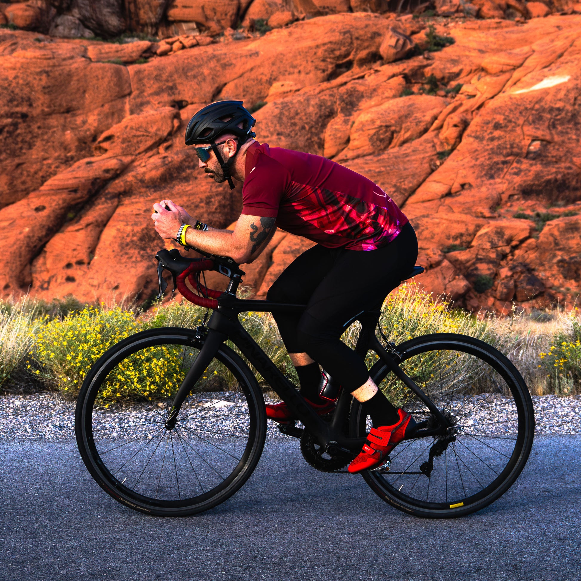 These details are captured in abstract side panels featuring shades of reds and browns with hints of purple, reflecting the vivid red rock patterns. The panels then stand out from the jersey's deep red base color.
