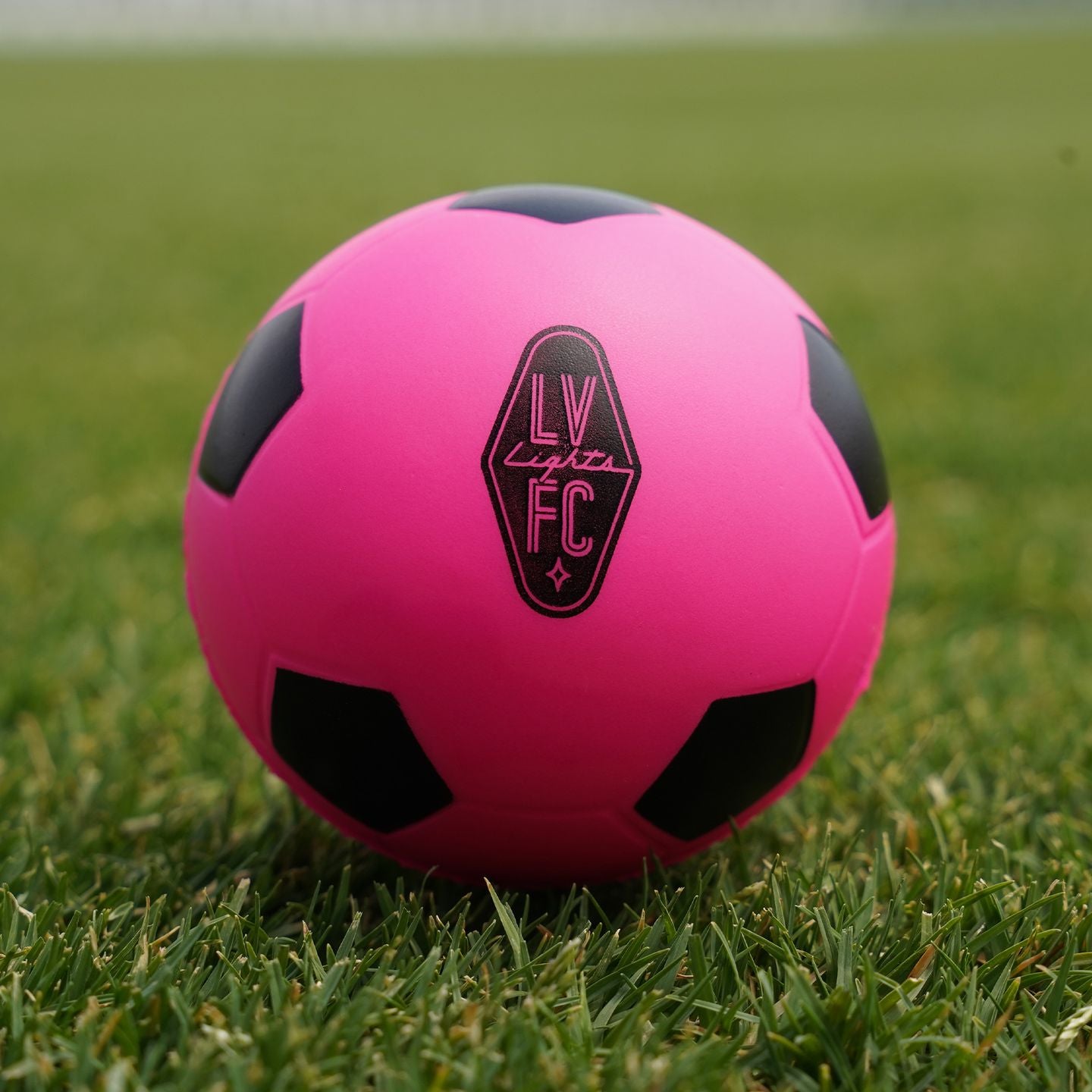 Small bright pink Las Vegas Lights FC stress ball that is designed to look like a soccer ball.